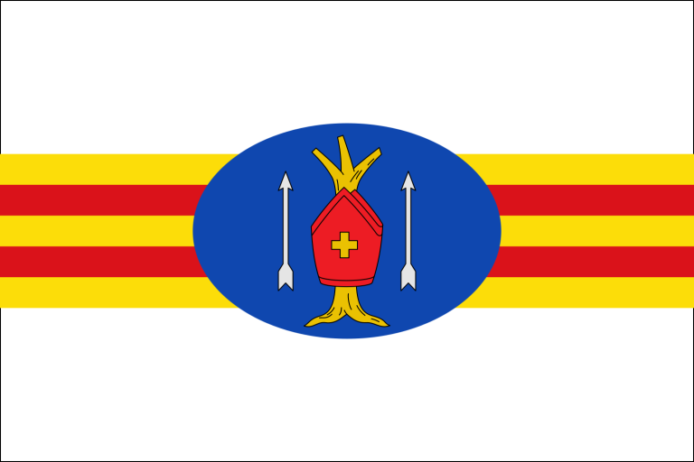 Paño blanco de proporciones 2/3, ancho por largo, con tres fajas amarillas y dos rojas, cuyo centro va resaltado de un óvalo azul con un árbol seco de tres ramas y dos raigones, amarillo, brochante una mitra roja cargada de una cruz griega amarilla, y acostado de dos saetas altas blancas.