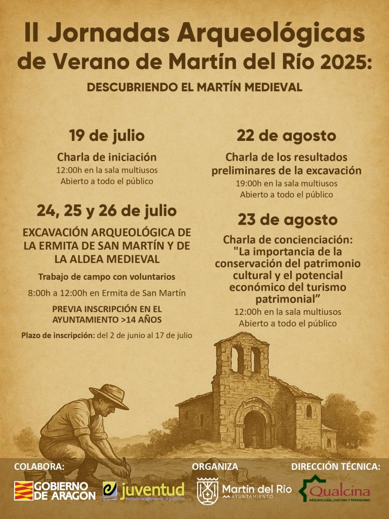 DESCUBRIENDO EL MARTÍN MEDIEVAL Tras la primera jornada arqueológica de verano en 2024, este año queremos dar un paso más allá: los jóvenes de Martín del Río se convertirán en auténticos arqueólogos. Bajo la dirección de un experto, formarán parte del equipo de excavación de la aldea medieval de Martín y su antigua iglesia (ermita